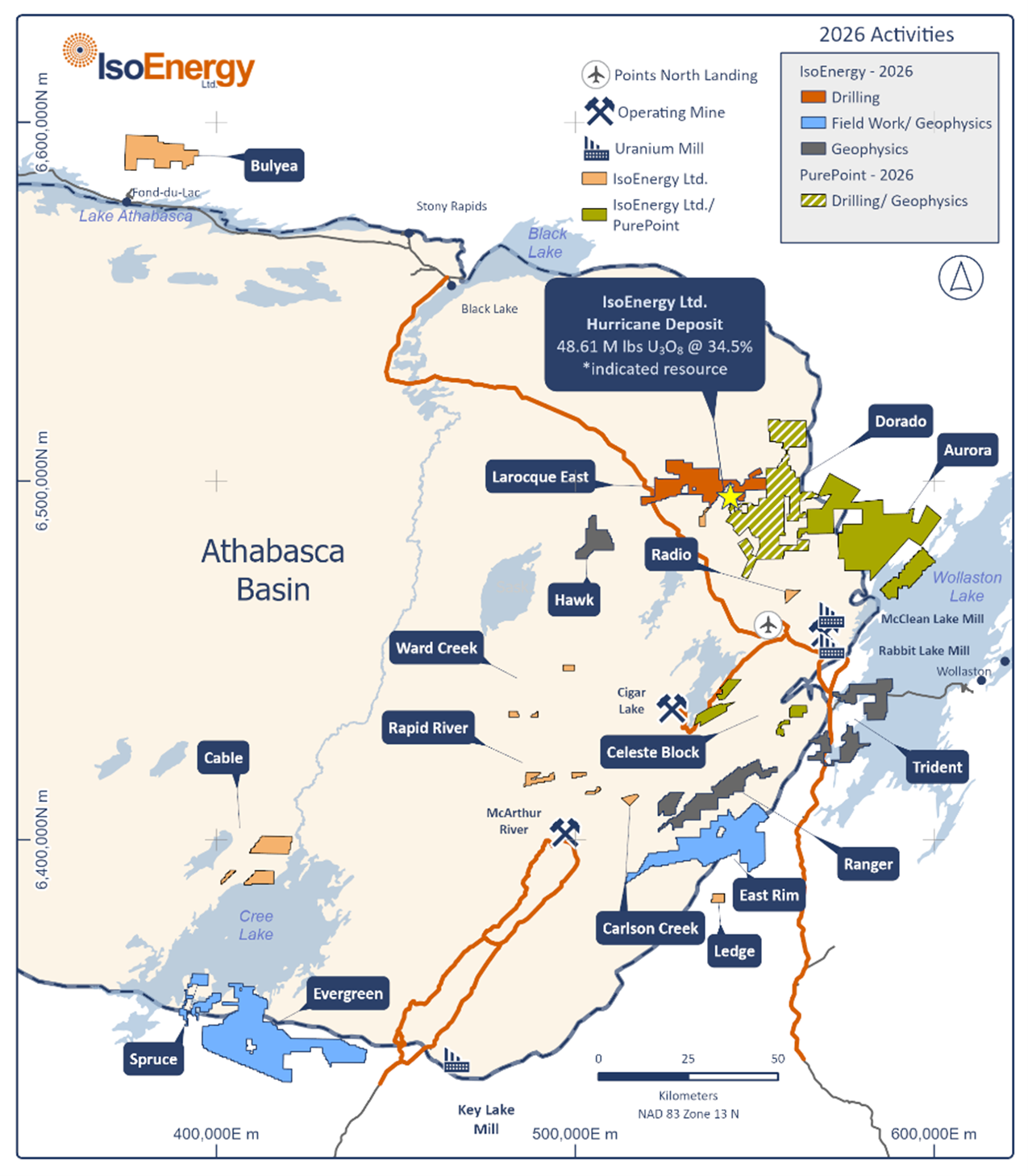 Abbildung 3 – Lage der Explorationsprojekte von IsoEnergy im östlichen Athabasca-Becken, hervorgehoben sind Projekte, für die 2026 Arbeiten geplant sind.