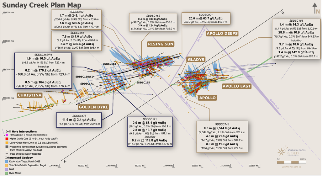 SDDSC168W1 durchteufte erfolgreich fünf Adersätze im Golden Dyke und ergab eine außergewöhnlich hochgradige Gold- und Antimonmineralisierung. Zu den bedeutenden Einzelergebnissen zählen 168 g/t Au und 0,9 % Sb über 0,2 m in 723,4 m sowie 68,2 g/t Au und 48,9 % Sb über 0,3 m in 776,4 m, wobei die Antimonwerte das dritthöchste bisher im Projekt erzielte Einzelergebnis für Antimon darstellen. SDD168W1 ist eine der tiefsten Bohrlöcher, die bei Golden Dyke gemeldet wurden, wobei sich die Westseite von Golden Dyke vertikal 560 m unter der Oberfläche erstreckt. Diese bedeutenden Gehalte sowie die texturale Erkennung von zwei hochgradigen Adergruppen (GD70 und GD90) unterstreichen das Potenzial von Golden Dyke, während weitere Bohrungen fortgesetzt werden, um die hochgradige Mineralisierung weiter zu erforschen und auszubauen.