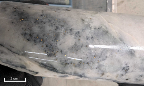 Abbildung 1: Sichtbares Gold in SDDSC208 mit Quarz + Karbonat + Sulfosalzen + Stibnit in einer 0,47 m langen Scherzone in 650,77 m Tiefe (309 g/t Au & 0,03 % Sb) innerhalb eines größeren Abschnitts von 1,8 m mit 80,5 g/t AuEq (79,9 g/t Au, 0,2 % Sb) ab 649,4 m.