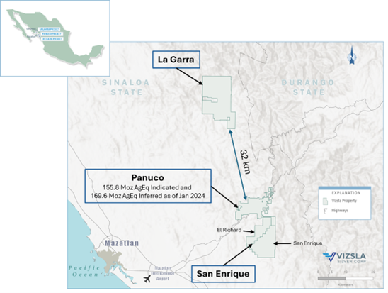 Abbildung 1. Übersichtskarte des Prospektionsgebietes San Enrique, des Projekts Panuco und von La Garra. Siehe Pressemitteilung des Unternehmens vom 8. Januar 2024 zur „Aktualisierten Mineralressourcenschätzung“ für das Projekt Panuco.