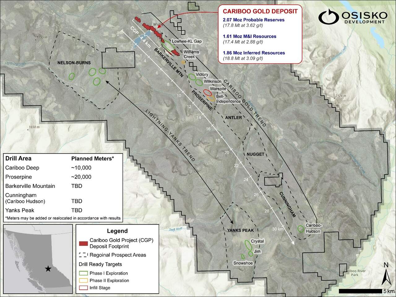 - Other Regional Targets: ~10,000 m in additional drill ready priority targets at Cunningham (Cariboo-Hudson)and Yanks Peak, southeast along strike in the Cariboo Gold trend and at the southeastern extent of the parallel Lightning-Yanks trend, respectively (Figure 1). Targets are constrained by geologic mapping and surface rock sampling over areas with identified anomalous gold in soils and are ready for stage 1 exploration drilling.